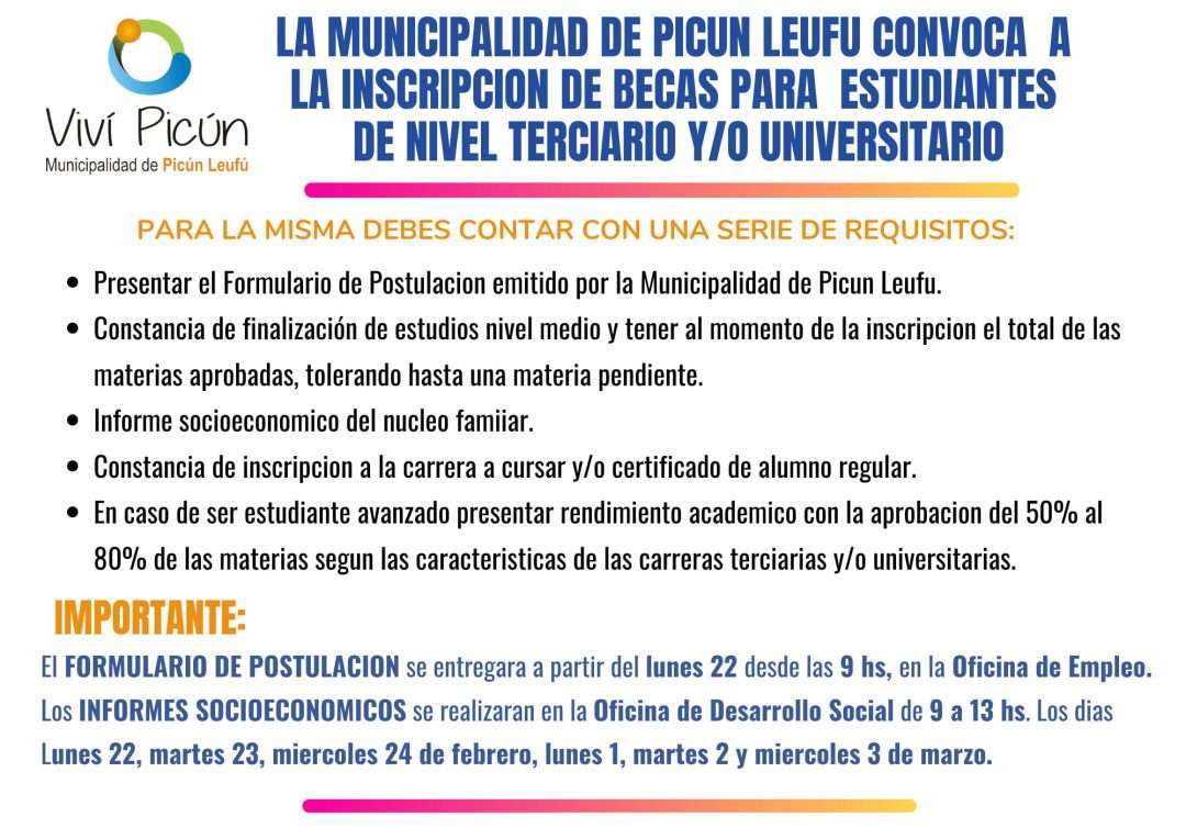 REQUISITOS: Presentar el Formulario de Postulacion emitido por la Municipalidad de Picun Leufu. Constancia de finalización de estudios nivel medio y tener al momento de la inscripcion el total de las materias aprobadas, tolerando hasta una materia pendiente. Informe socioeconomico del nucleo famiiar. Constancia de inscripcion a la carrera a cursar y/o certificado de alumno […]