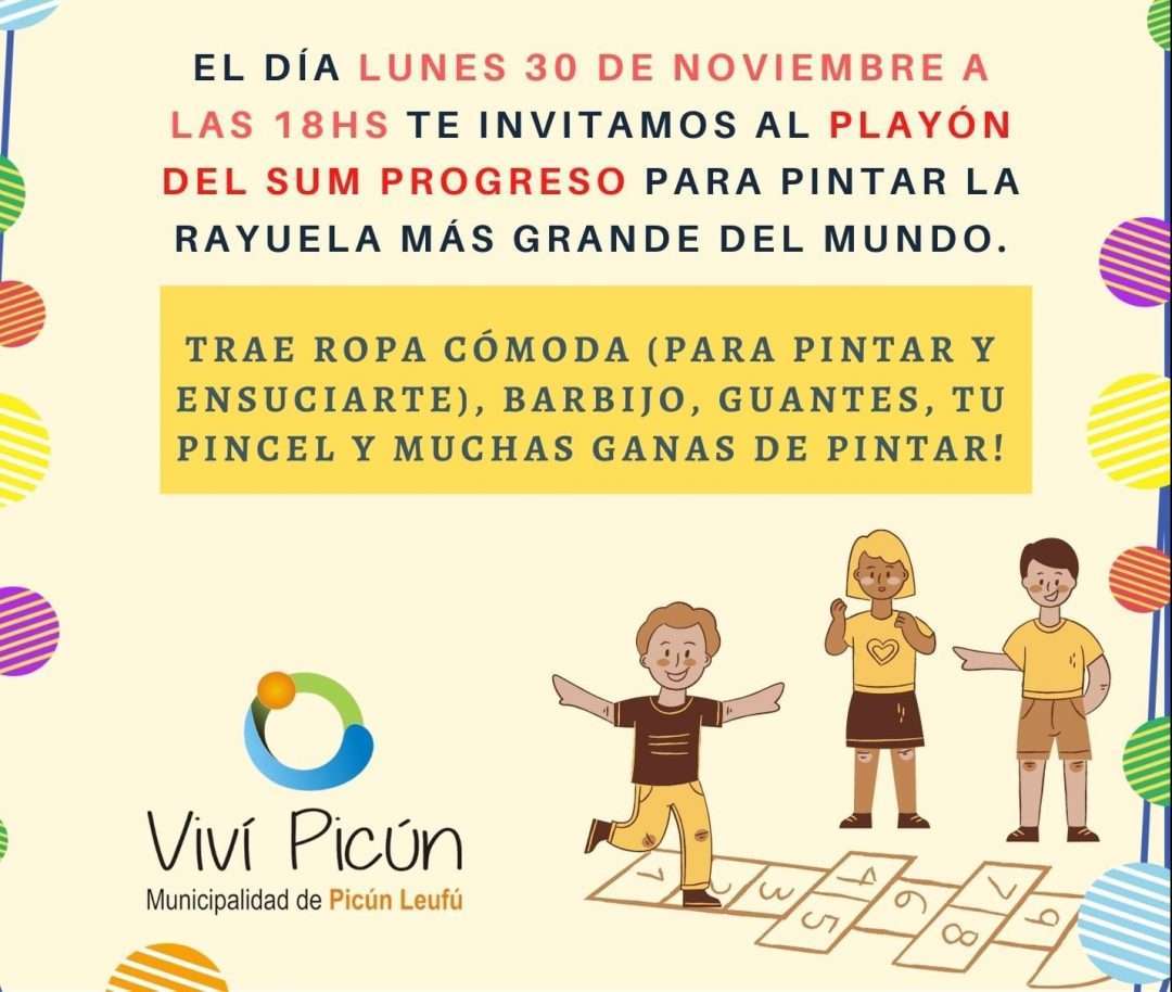 La Red Nacional y Provincial Proyecto Internacional de Ciudades de Niños y Niñas y la Municipalidad de Picún Leufú, invitan en el marco de la Conmemoración de los Derechos del Niño a los menores de 04 a 12 años a ser parte de la rayuela mas grande del mundo. ¿Cómo tenes que hacer? Envíanos un